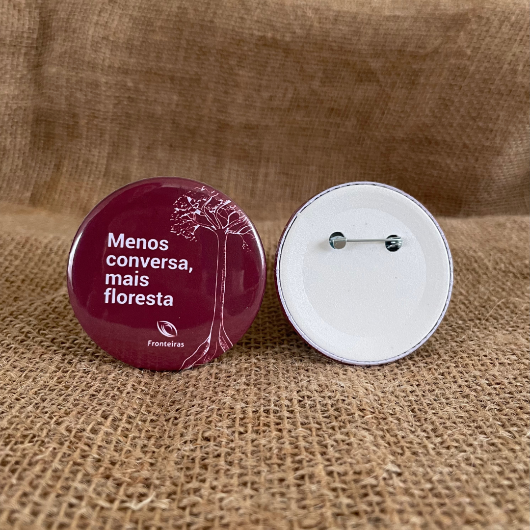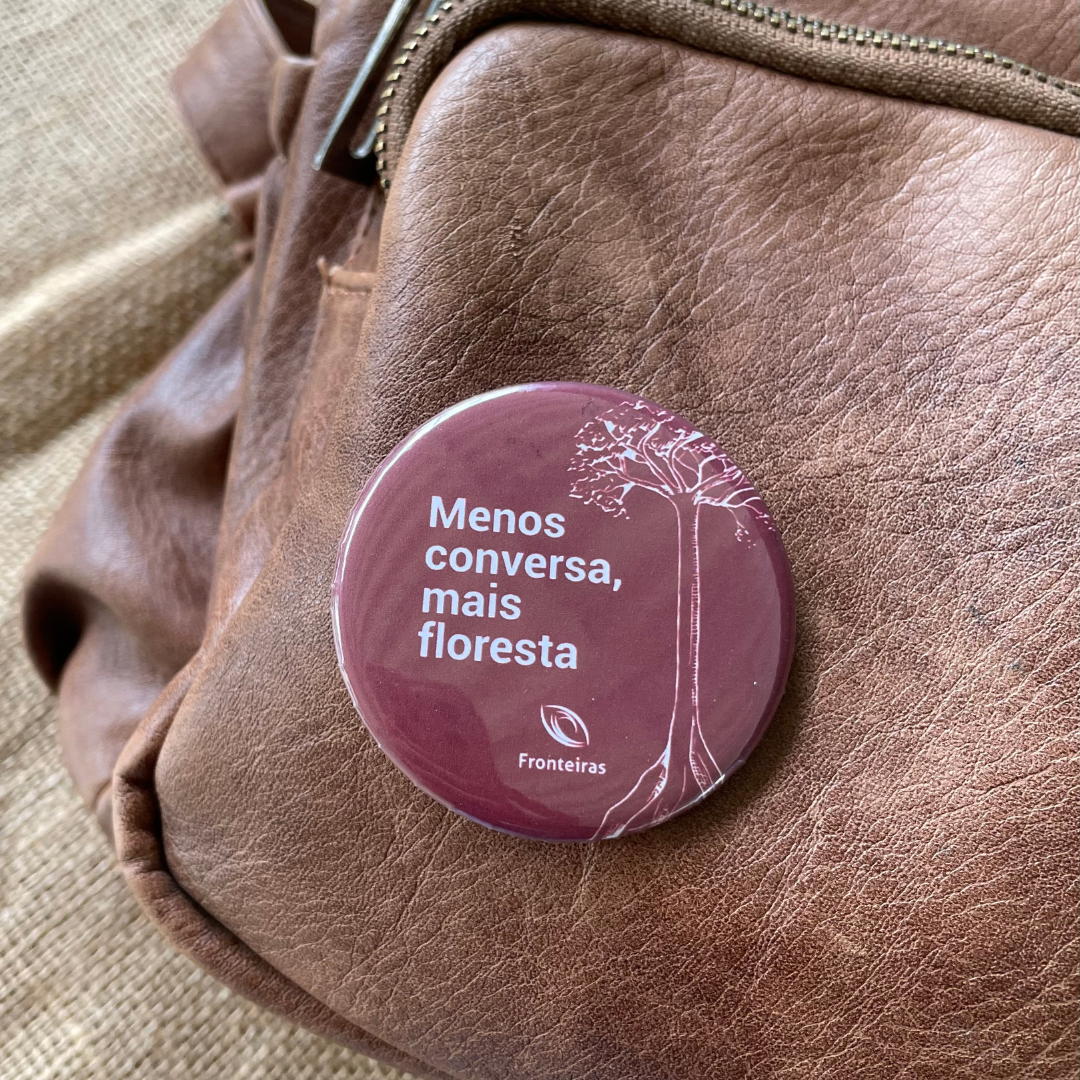 O botton “Menos Conversa, Mais Floresta” expressa a urgência de agir, e fortalecer quem vive no território e colocar a conservação no centro das decisões  muito além dos discursos.