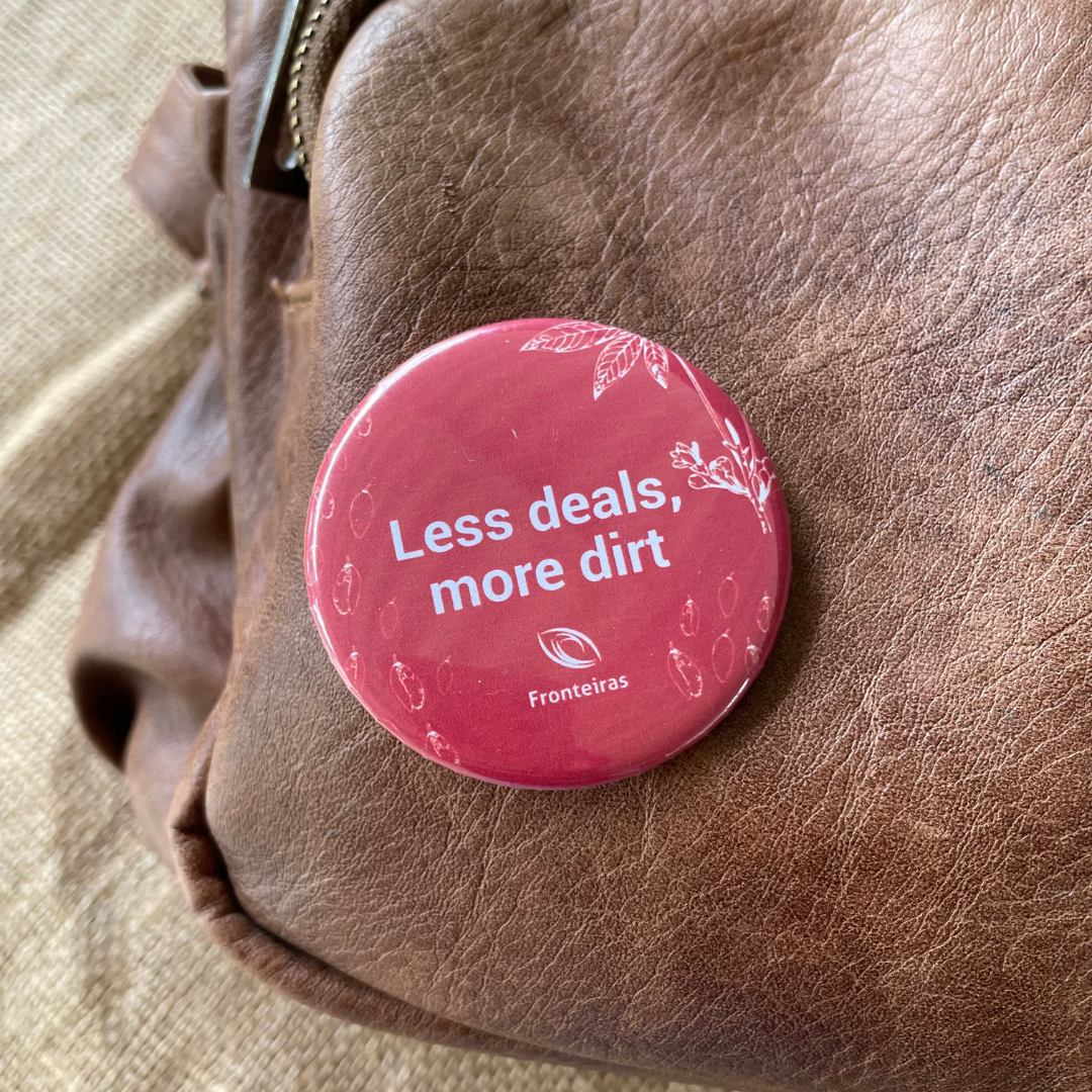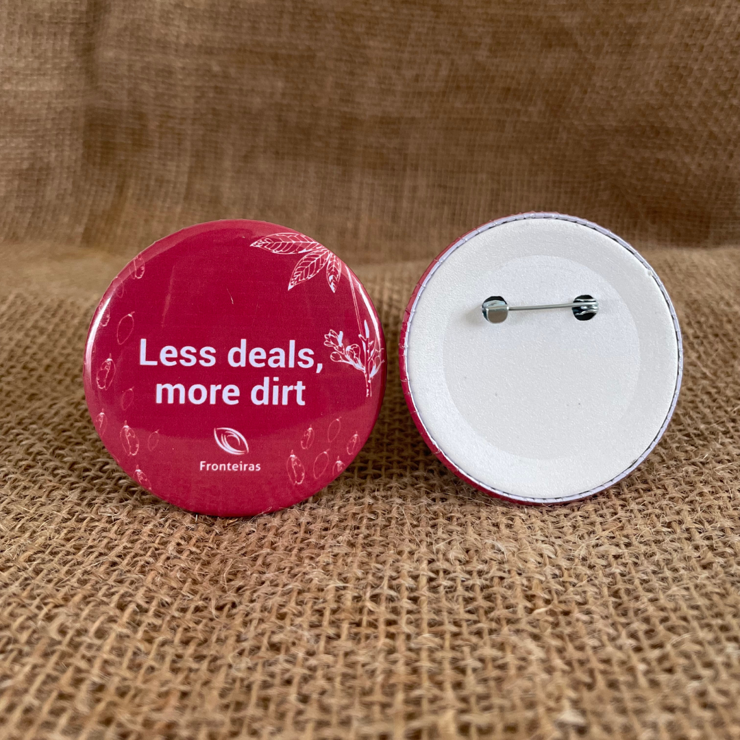 O botton “Less deals, more dirt” reforça a importância da presença, da ação concreta e do compromisso real com as comunidades e com a floresta muito além das promessas no papel.