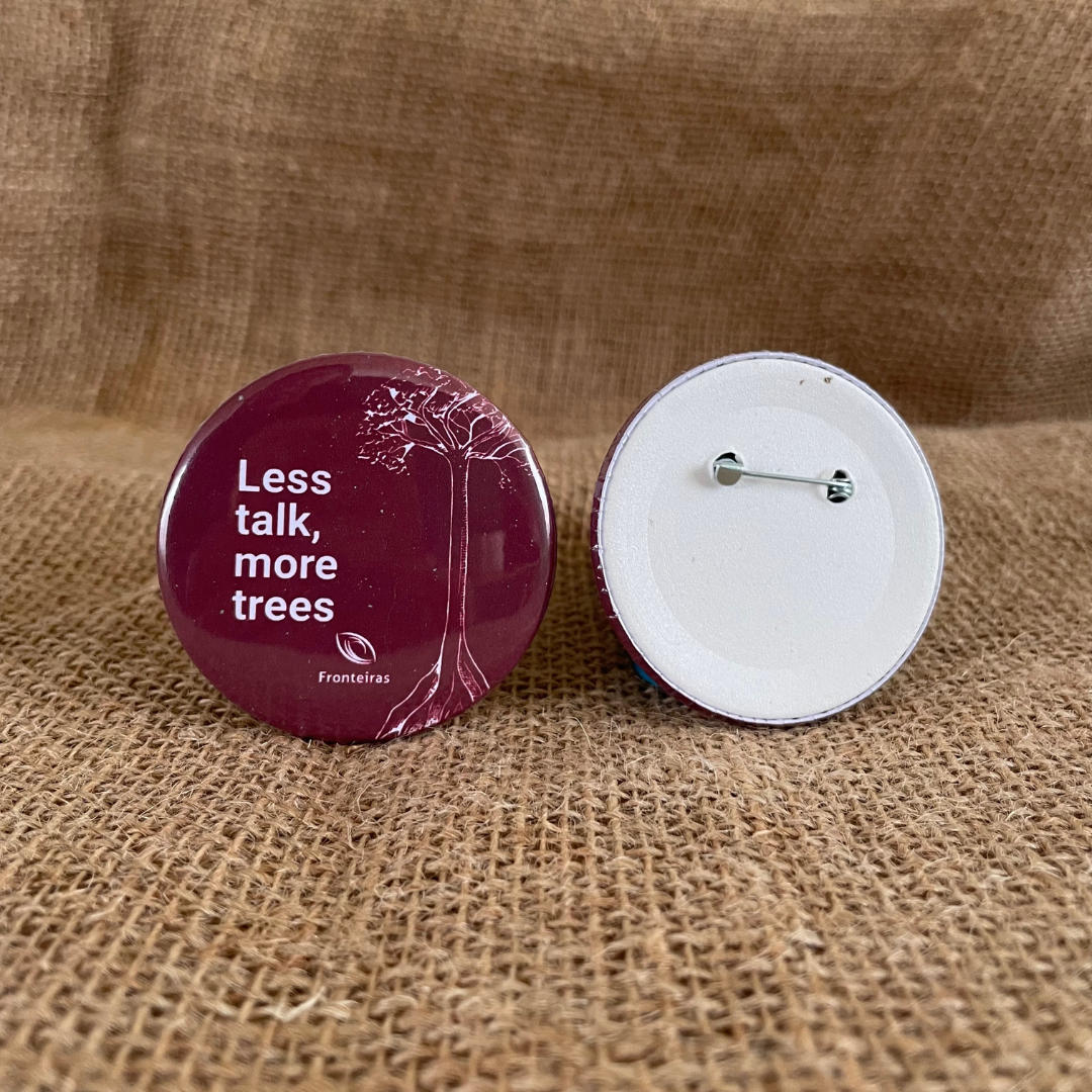 Um chamado para quem acredita que a proteção da Amazônia acontece na prática. O botton “Less talk, more trees” expressa a urgência de agir, e fortalecer quem vive no território e colocar a conservação no centro das decisões muito além dos discursos.